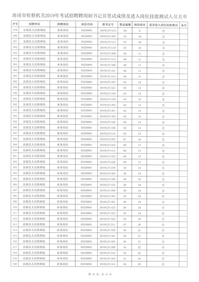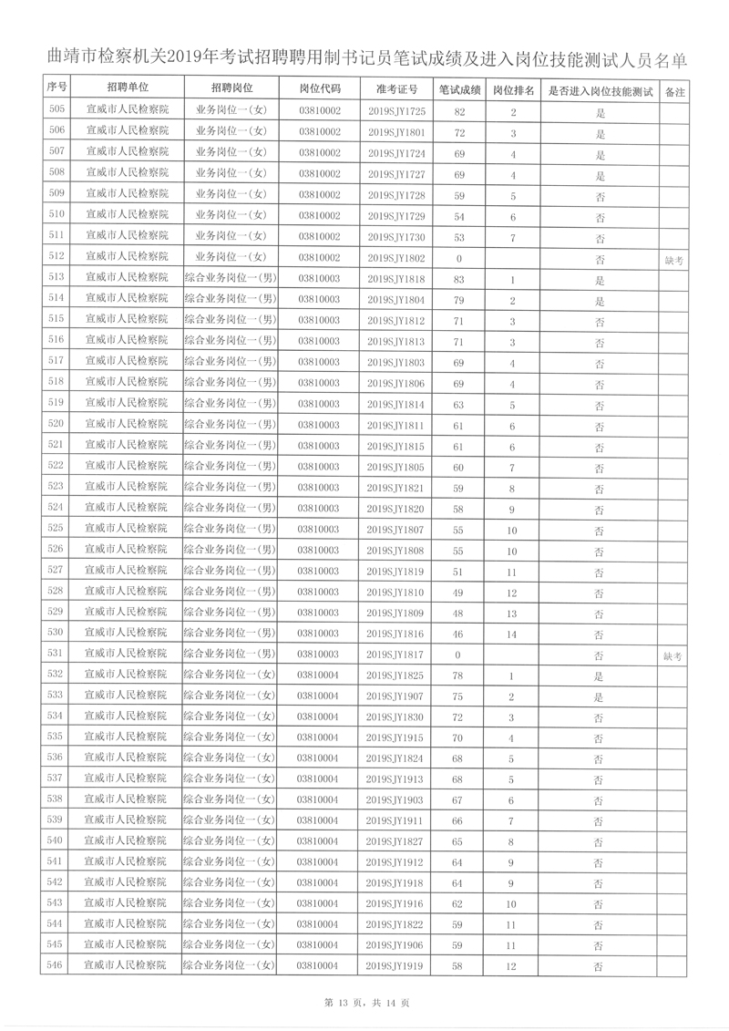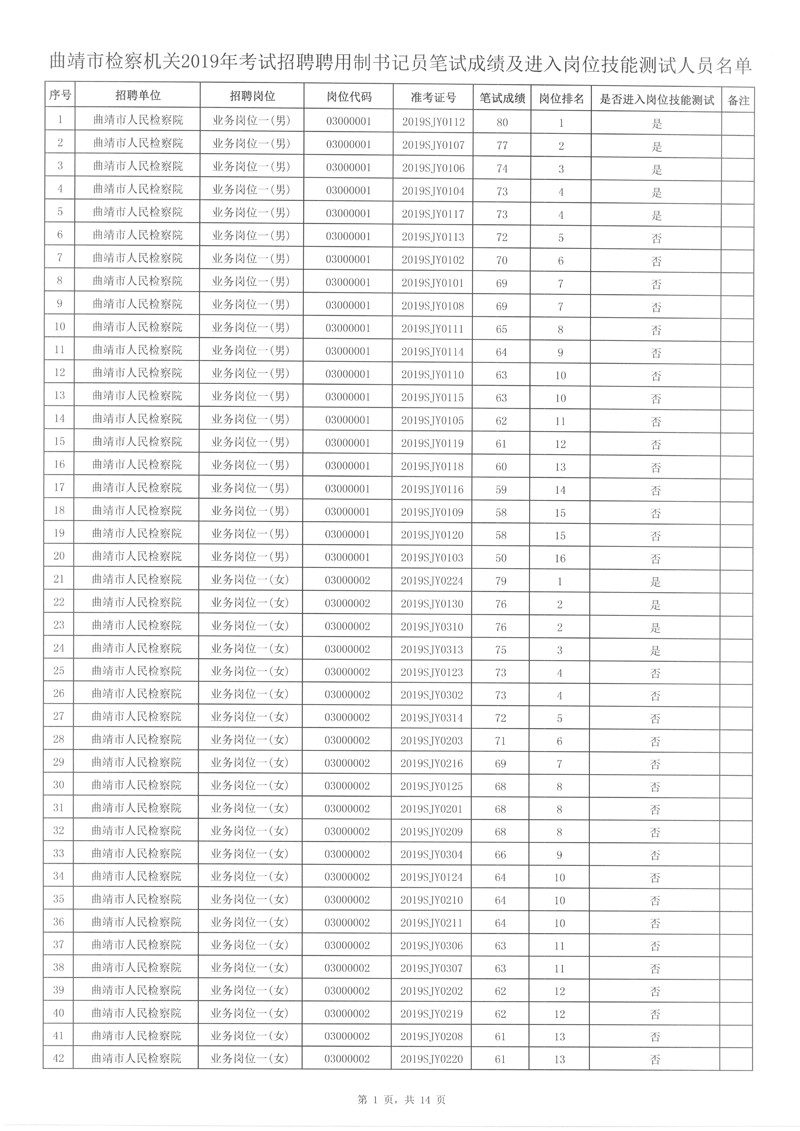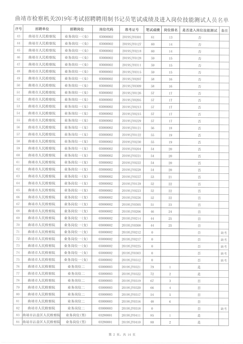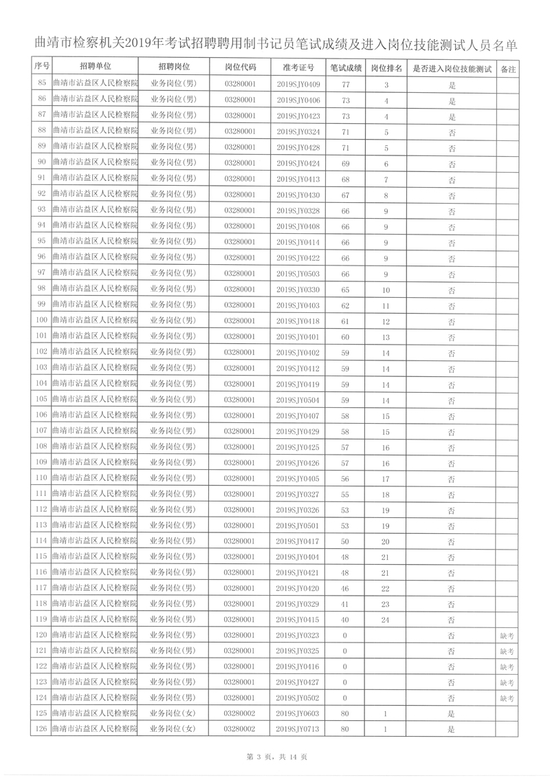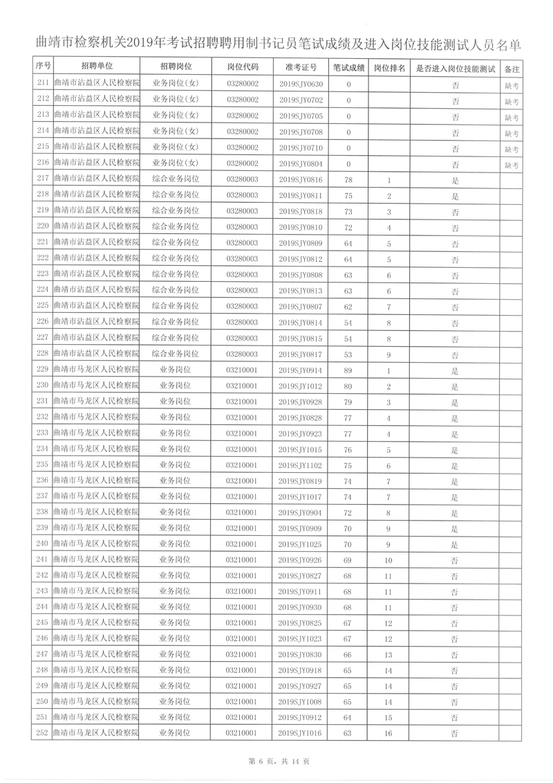 附件: 曲靖市檢察機關(guān)2019年考試招聘聘用制書記員筆試成績及進入崗位技能測試人員名單。