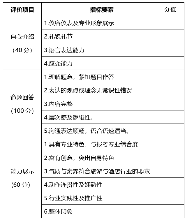 (3)能力展示(60分):包括才藝展示(如唱歌、跳舞、講故事、朗誦、游戲、節(jié)目主持、魔術(shù)、樂器、體育運動、模特展示等)、對旅游與酒店行業(yè)與專業(yè)的認知和技能的展示(如旅游與酒店業(yè)態(tài)發(fā)展簡述、旅游營銷技巧展示、對客服務(wù)疑難問題處理等),考生自行選擇上述內(nèi)容其中一項進行展示。