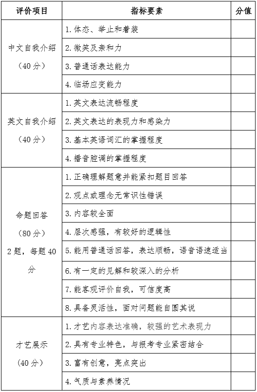(1)自我介紹(40分):考生使用普通話或英語進行不超過3分鐘的自我介紹,考查學(xué)生的體態(tài)、舉止、溝通能力、普通話或英語口語表達能力及應(yīng)變能力。