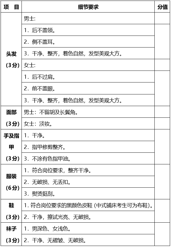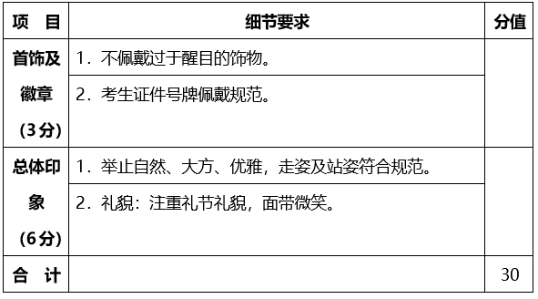 (1)儀容儀表(30分):考生根據(jù)考官口令,在1分鐘內(nèi)展示考生衣著、儀表、舉止、五官、姿態(tài)、肢體表達等;