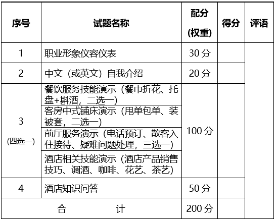 (3)酒店服務(wù)技能展示(100分):考生在5分鐘內(nèi),選擇餐飲(餐巾折花、托盤+斟酒,二選一)、客房(甩單包單、裝被套,二選一)、前廳(電話預(yù)訂、散客入住接待、疑難問題處理,三選一)或與酒店相關(guān)的技能(酒店產(chǎn)品銷售技巧、調(diào)酒、咖啡、花藝、茶藝五選一)進行技能演示;