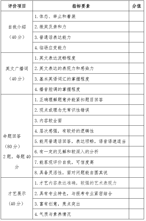 (2)自我介紹(20分):考生使用普通話或英語進行不超過1分鐘的自我介紹,考查學(xué)生的普通話或英語表達能力、語言組織能力、邏輯思維能力和臨場應(yīng)變能力;