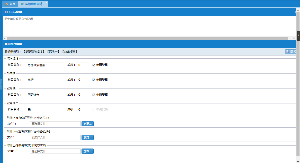 考生進(jìn)入系統(tǒng)后雙擊左側(cè)功能樹中“成績(jī)復(fù)核申請(qǐng)”,選擇需申請(qǐng)復(fù)核科目,同時(shí)上傳成績(jī)復(fù)核申請(qǐng)表(PDF格式)、身份證照片或掃描件(JPG格式)、準(zhǔn)考證照片或掃描件(JPG格式)。三個(gè)文件必須按要求的格式上傳,缺一不可,否則不可提交。