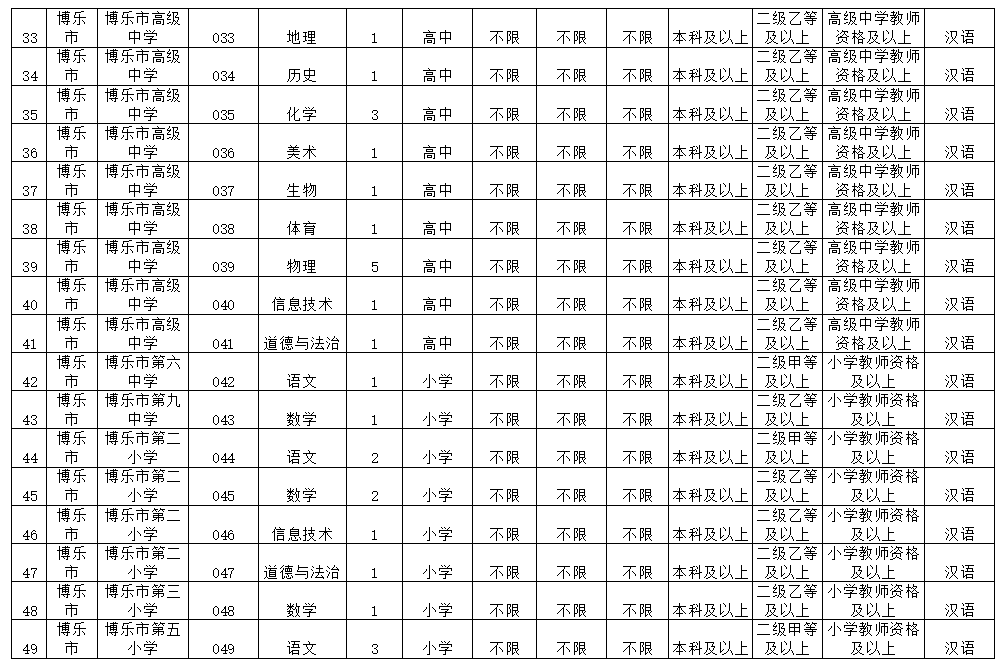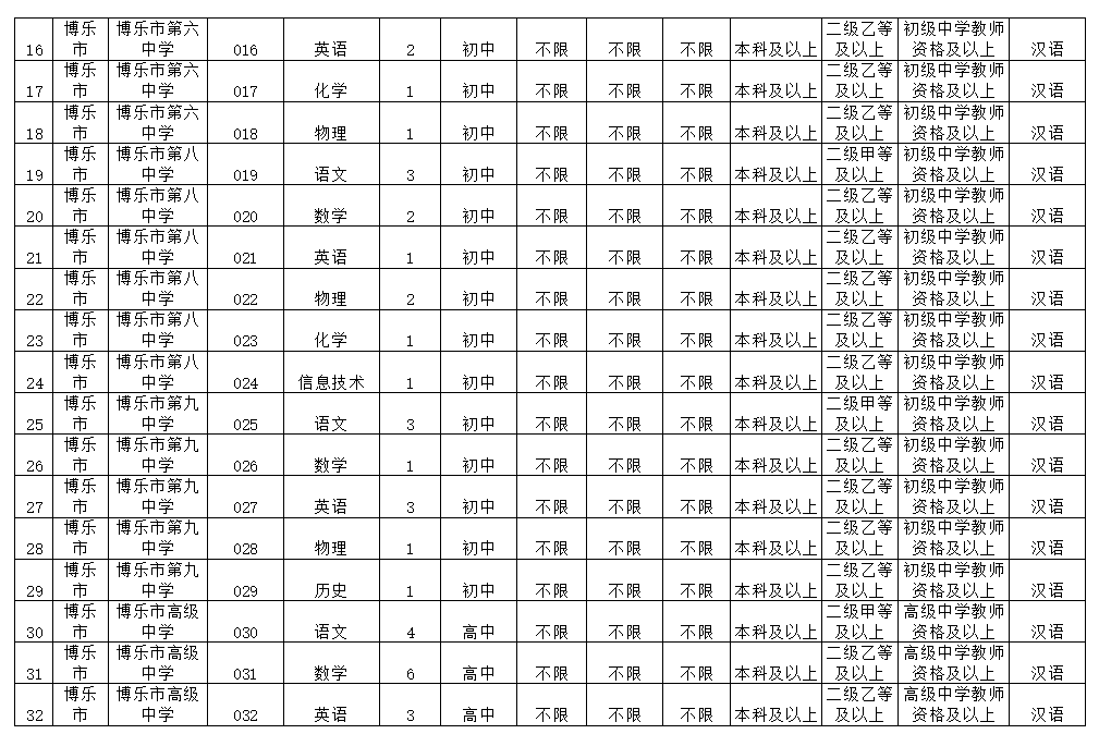 6.符合臨聘崗位所需的其他資格條件,詳見《2020年春季博樂市教育系統(tǒng)面向社會公開教師崗位表》。