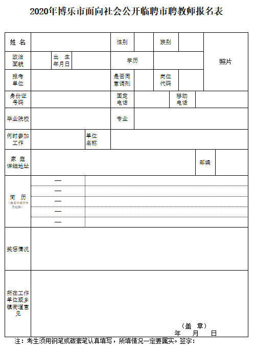 附件2:2020年博樂市面向社會公開臨聘市聘教師報名表