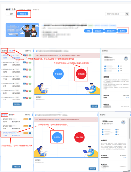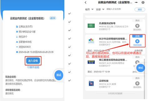 視頻招聘會(huì)當(dāng)天,求職者可以自主申請(qǐng)面試,建議用人單位在開始前半小時(shí)進(jìn)入面試間,先點(diǎn)擊頁(yè)面設(shè)備調(diào)試,查看麥克風(fēng)和攝像頭是否正常(請(qǐng)使用谷歌瀏覽器,面試只能通過視頻,需要配備攝像頭以及麥克風(fēng)),同時(shí)預(yù)先處理求職者的面試申請(qǐng)信息。招聘會(huì)開始后,可以針對(duì)“待面試”列表中的“在線”求職者發(fā)起視頻邀約,也可以直接接收求職者發(fā)起的面試邀約。