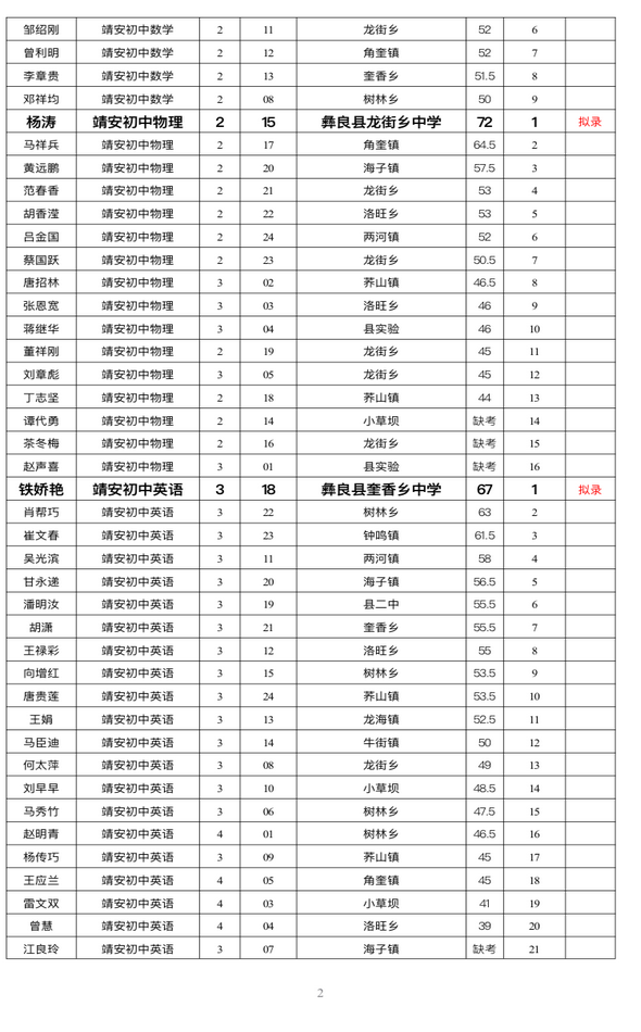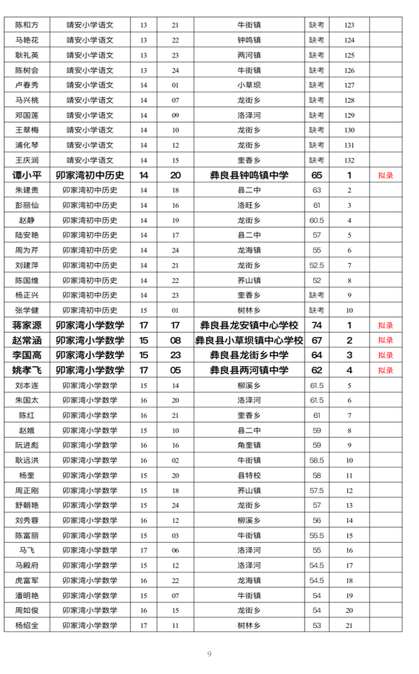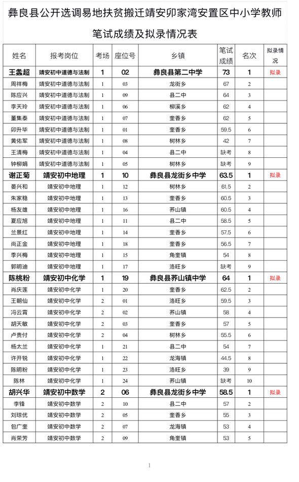 彝良縣公開選調(diào)易地扶貧搬遷靖安、卯家灣安置區(qū)中小學(xué)教師選調(diào)筆試工作,在縣公開選調(diào)易地扶貧搬遷靖安卯家灣安置區(qū)中小學(xué)教師工作領(lǐng)導(dǎo)組領(lǐng)導(dǎo)下,在縣紀(jì)檢監(jiān)察、人社、機(jī)要保密、公安等部門的全程指導(dǎo)和配合下,已于2020年3月20日全面完成,經(jīng)過閱卷、試卷復(fù)核、考分復(fù)核、登分復(fù)核,已確定了筆試成績和擬錄人員,現(xiàn)將筆試成績和擬錄人員以及有關(guān)事項(xiàng)公告如下: