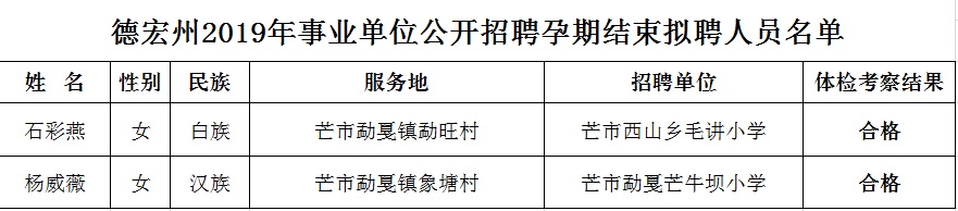 德宏州2019年事業(yè)單位公開招聘孕期結束擬聘人員公示