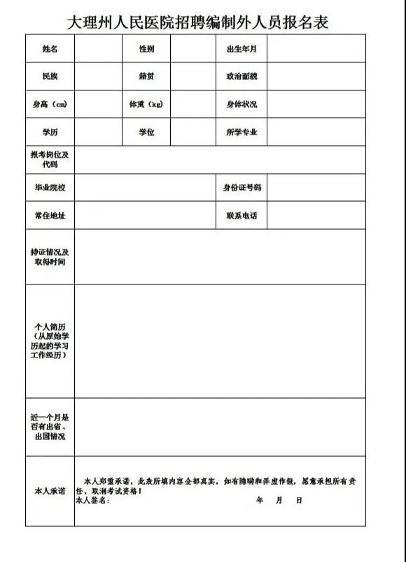 3、報名注意事項(xiàng):報名人員須對照崗位要求,如實(shí)填寫《大理州人民醫(yī)院招聘編制外人員報名表》,筆試前招聘工作組將對參加考試人員進(jìn)行資格復(fù)審,凡有弄虛作假、個人信息不一致、不符合崗位要求者,取消考試資格。