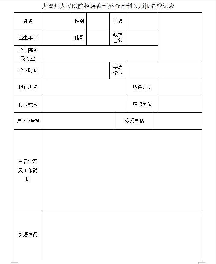 (四)報名要求:報名人員請自行下載附件填寫《大理州人民醫(yī)院招聘編制外合同制醫(yī)師報名登記表》,并按要求提供相關(guān)證件及材料。