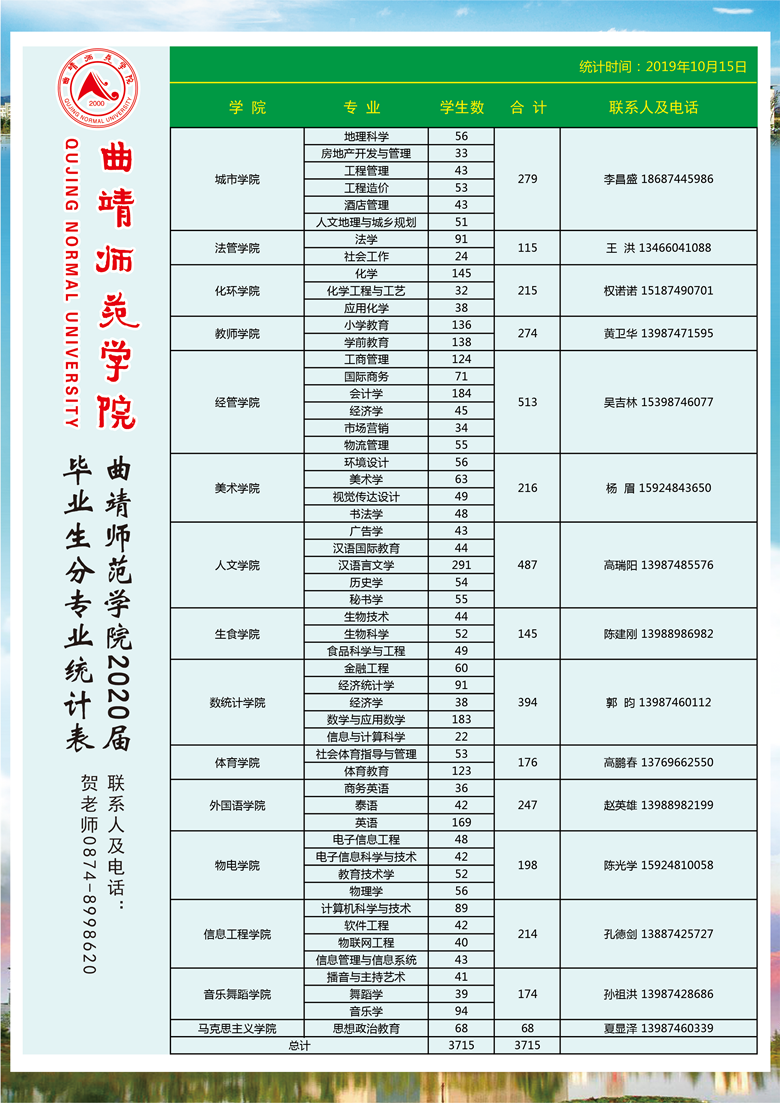 曲靖師范學院2020年畢業(yè)生分專業(yè)情況及就業(yè)聯(lián)系方式統(tǒng)計表