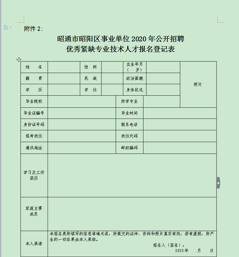 2.昭通市昭陽區(qū)事業(yè)單位2020年公開招聘優(yōu)秀緊缺專業(yè)技術人才報名登記表
