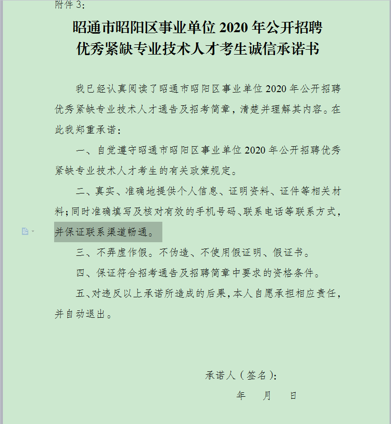 3.昭通市昭陽區(qū)事業(yè)單位2020年公開招聘優(yōu)秀緊缺專業(yè)技術人才考生誠信承諾書