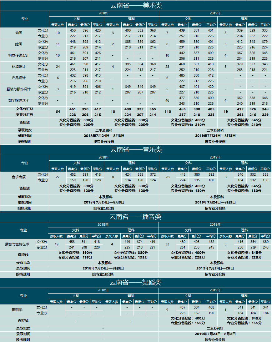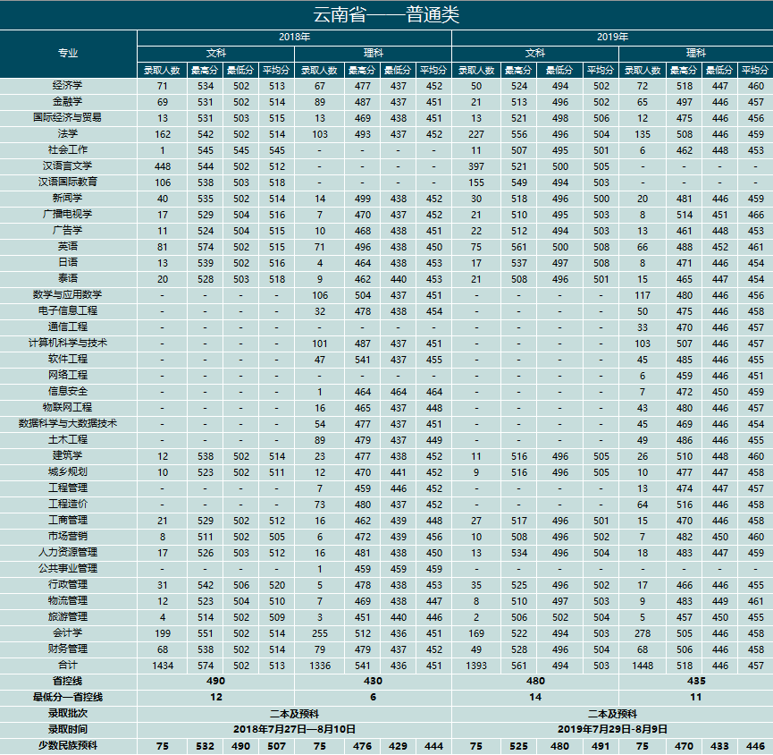 云南大學滇池學院2018、2019年云南省招生錄取情況統(tǒng)計