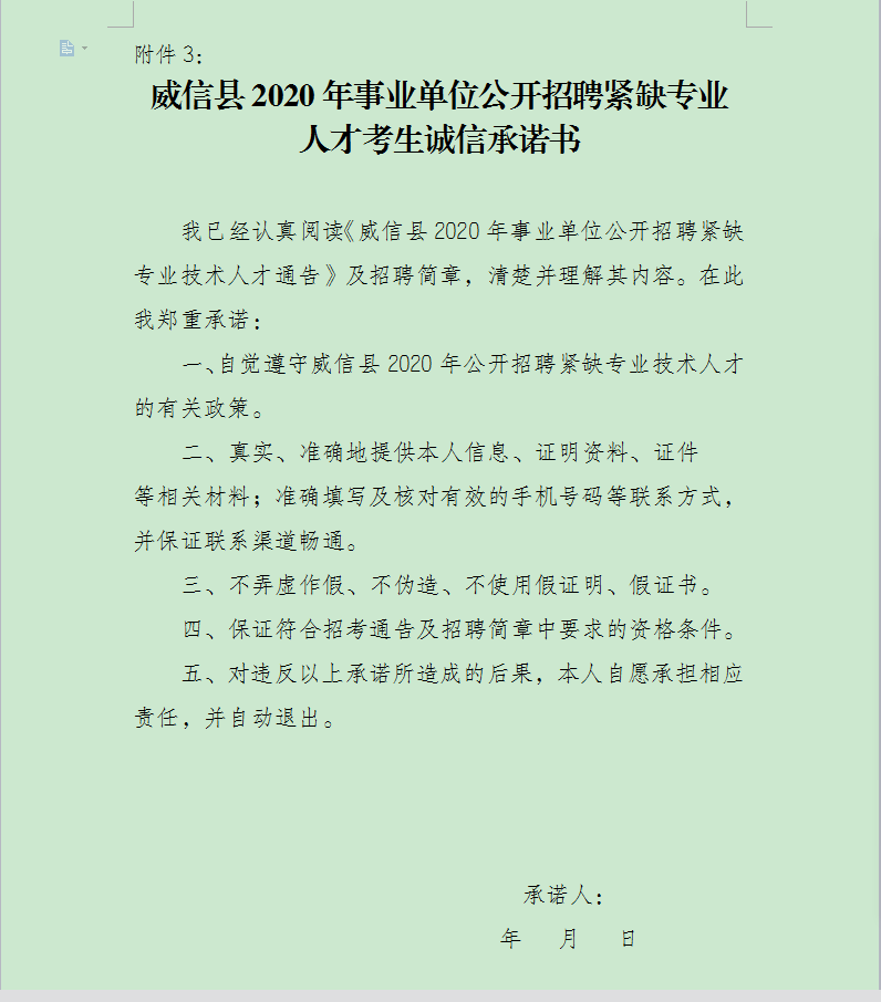3.威信縣2020年事業(yè)單位公開招聘緊缺專業(yè)人才考生誠(chéng)信承諾書