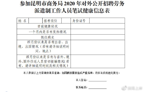 根據(jù)疫情防控要求,請(qǐng)參加筆試的考生,將健康信息表下載打印,如實(shí)填寫(xiě)相關(guān)內(nèi)容并簽字,同時(shí)用手機(jī)掃描云南健康碼,把健康碼截圖后,一并打印,考試當(dāng)天提交考場(chǎng)工作人員。
