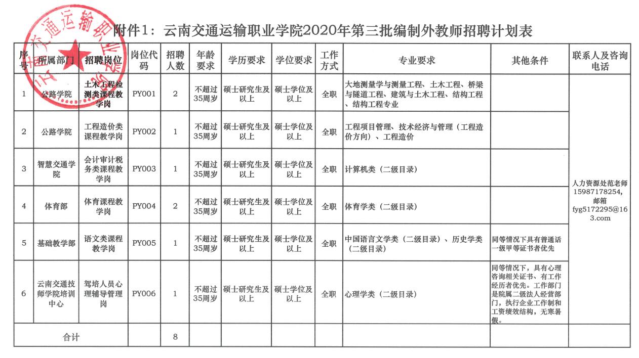 招聘崗位、專業(yè)及相關(guān)要求詳見《云南交通運輸職業(yè)學(xué)院2020年編制外教師招聘計劃表》(附件1)。報名時間:2020年5月12日至5月20日。