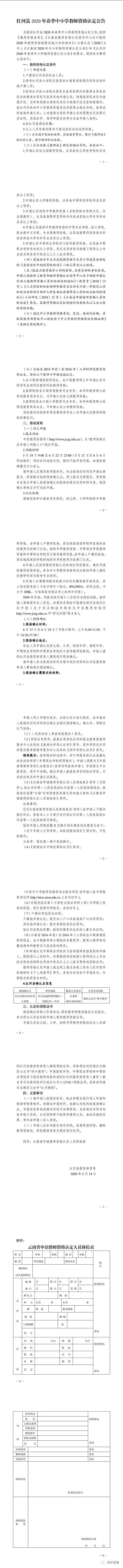 紅河州紅河縣2020年春季教師資格認定公告