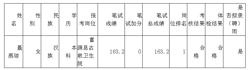根據(jù)中共曲靖市委組織部 曲靖市人力資源和社會保障局《關(guān)于印發(fā)<曲靖市事業(yè)單位公開招聘人員試行辦法>的通知》(曲人社〔2011〕55號)、《曲靖市2019年事業(yè)單位委托公開招聘工作人員公告(含委托招聘計(jì)劃)》、《關(guān)于對懷孕考生參加體檢有關(guān)問題的復(fù)函》(國公考錄函〔2009〕07號)等文件規(guī)定和本人延期體檢申請書,考生聶燕瓊按程序于2020年5月19日完成體檢,現(xiàn)將體檢結(jié)果及擬錄(聘)用情況公示如下: