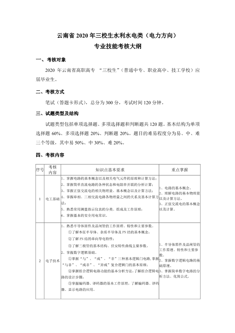 云南省2020年三校生水利水電類(電力方向) 專業(yè)技能考核大綱