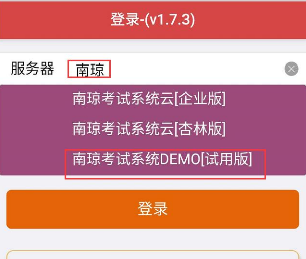 3、在服務(wù)器中 輸入【南瓊】,選擇【南瓊考試系統(tǒng)DEMO試用版】