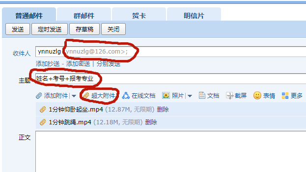 開始考試前,考生手持身份證于胸前置于鏡頭內(nèi)、身份證信息和頭像清晰可見,報告自己的姓名及準考證號、報考專業(yè)。服裝方面要求穿著運動服,款式和顏色不限。每段視頻長度控制在1.5分鐘以內(nèi),文件小于50M,文件格式為MP4,視頻分辨率不低于960*544,兩個視頻文件分別命名為:1分鐘跳繩、1分鐘仰臥起坐(先后順序不限)。視頻文件一律采用QQ郵箱超大附件模式發(fā)送,視頻錄制現(xiàn)場要求安靜且采光良好,測試內(nèi)容的視頻必須完整,視頻不允許有剪輯或者修改等痕跡,要求一次錄制完成,考生可多次錄制,選取自己認為最好的一次上傳郵件,發(fā)送視頻郵件地址為:ynnuzlg@126.com: