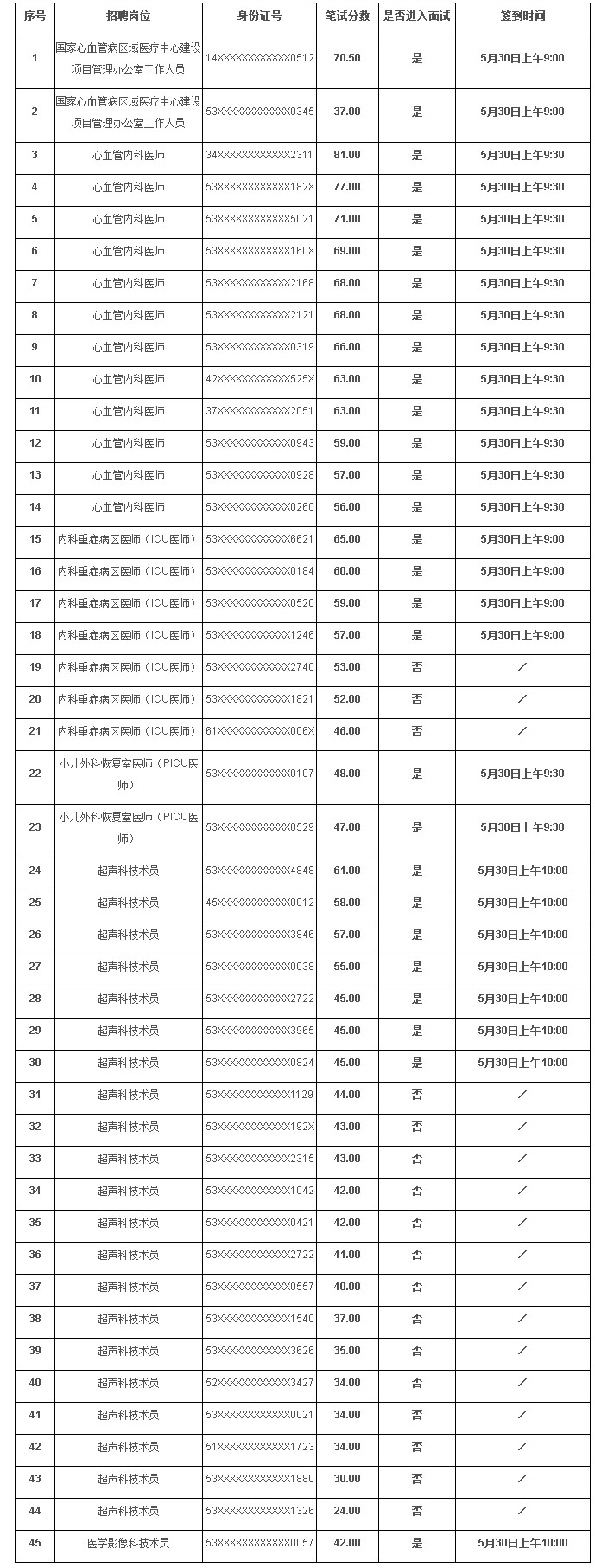 云南省阜外心血管病醫(yī)院2020年第一批公開招聘筆試成績及進(jìn)入面試人員名單