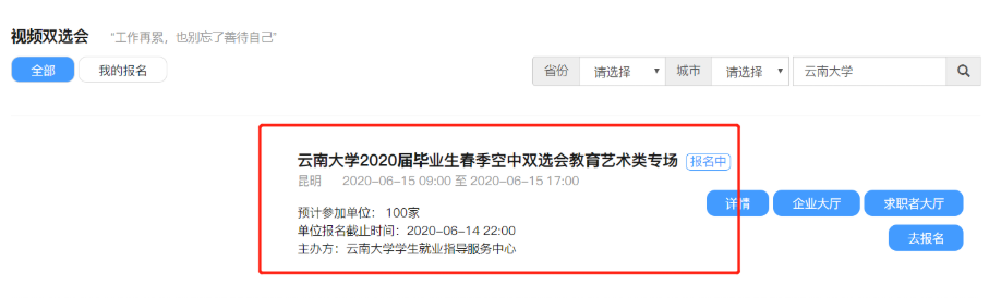 3、選擇需要參加的視頻雙選會(huì)場(chǎng)次,選擇云南大學(xué)2020屆畢業(yè)生春季空中雙選會(huì)教育藝術(shù)類專場(chǎng)了解詳情。