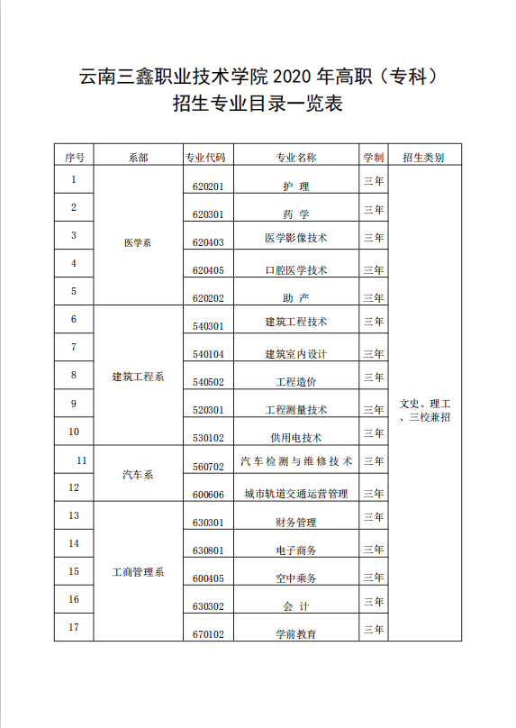 云南三鑫職業(yè)技術(shù)學(xué)院 2020 年高職(??疲?招生專業(yè)目錄一覽表