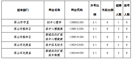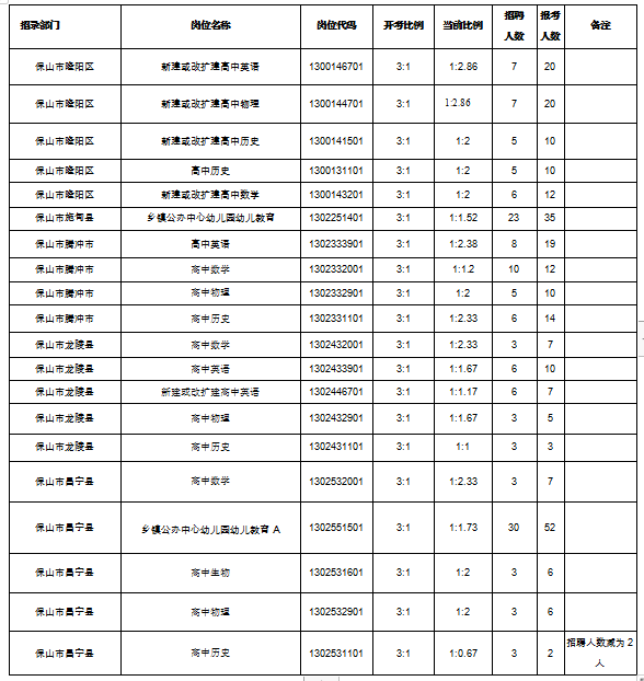 根據(jù)《保山市應(yīng)對(duì)新冠肺炎疫情影響大幅增加名額面向全國(guó)開展基礎(chǔ)教育學(xué)校專項(xiàng)招聘優(yōu)秀高校畢業(yè)生公告》及有關(guān)規(guī)定,2020年保山市面向全國(guó)開展基礎(chǔ)教育學(xué)校專項(xiàng)招聘優(yōu)秀高校畢業(yè)生計(jì)劃招聘崗位106個(gè),共計(jì)575人。網(wǎng)絡(luò)報(bào)名工作已于6月6日上午12:00結(jié)束。經(jīng)統(tǒng)計(jì)共有2659名考生通過資格審查、繳費(fèi)、完成報(bào)名。在計(jì)劃招聘的106個(gè)崗位中有81個(gè)崗位(含11個(gè)不設(shè)開考比例的崗位,70個(gè)報(bào)名人數(shù)與招聘人數(shù)達(dá)到或超過3:1比例的崗位)可以正常開考;取消5個(gè)無(wú)人報(bào)考崗位招聘計(jì)劃14人;有20個(gè)崗位報(bào)名人數(shù)與招聘人數(shù)達(dá)不到3:1的比例,經(jīng)中共保山市委組織部、保山市人力資源和社會(huì)保障局、保山市教育體育局研究,并征求了保山市紀(jì)委市監(jiān)委派駐市人力資源和社會(huì)保障局紀(jì)檢監(jiān)察組意見,進(jìn)行了崗位調(diào)劑,調(diào)劑后同意這20個(gè)崗位開考(含1個(gè)減少招聘計(jì)劃1人的崗位)?,F(xiàn)將報(bào)名及崗位調(diào)劑情況向廣大考生進(jìn)行公布(詳見附件)。