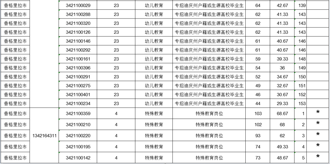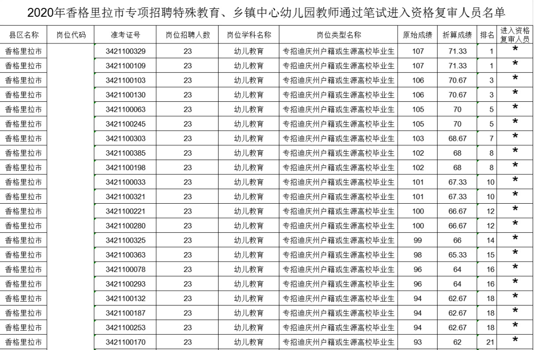我市將于2020年6月18日(上午9:00—12:00,下午2:30—5:30)在香格里拉市人力資源和社會保障局三樓進行2020年香格里拉市專項招聘特殊教育、鄉(xiāng)鎮(zhèn)中心幼兒園教師崗位資格復(fù)審。報考免筆試崗位的考生請按公告按時參加資格復(fù)審。特殊教育崗位不設(shè)開考比例,招聘人數(shù)與報名人數(shù)比例達不到1:2,筆試成績合格分數(shù)線劃定為折后分數(shù)45分。現(xiàn)將通過筆試進入資格復(fù)審人員公告如下,“ * ”為進入資格復(fù)審人員,請按時參加。