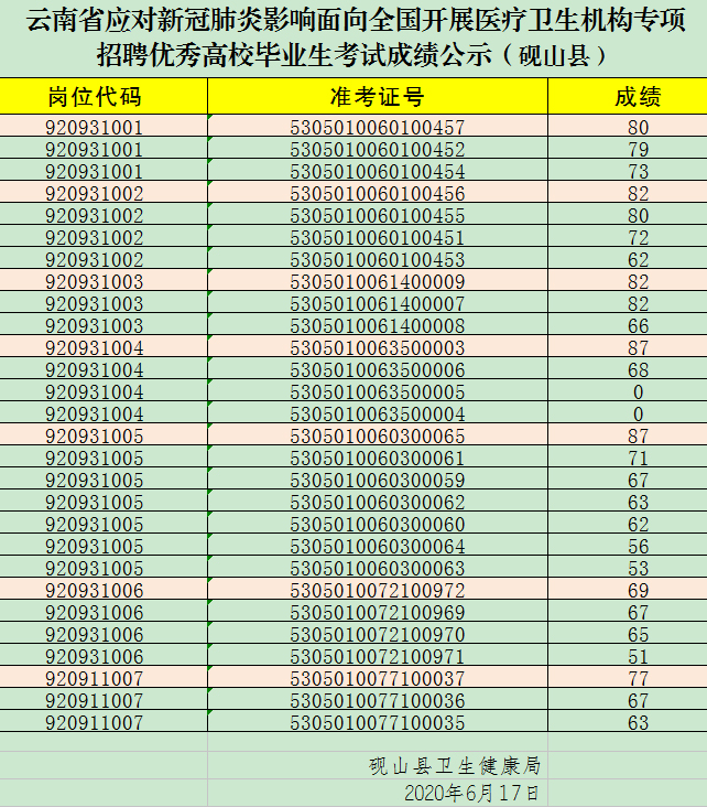 云南省應對新冠肺炎影響面向全國開展 醫(yī)療衛(wèi)生機構專項招聘優(yōu)秀高校畢業(yè)生考試成績公示(硯山縣) 來源:http://yanshan.gov.cn/zfxxgkqcscxx/zfxxgkzn322/zpxx1/content_52850