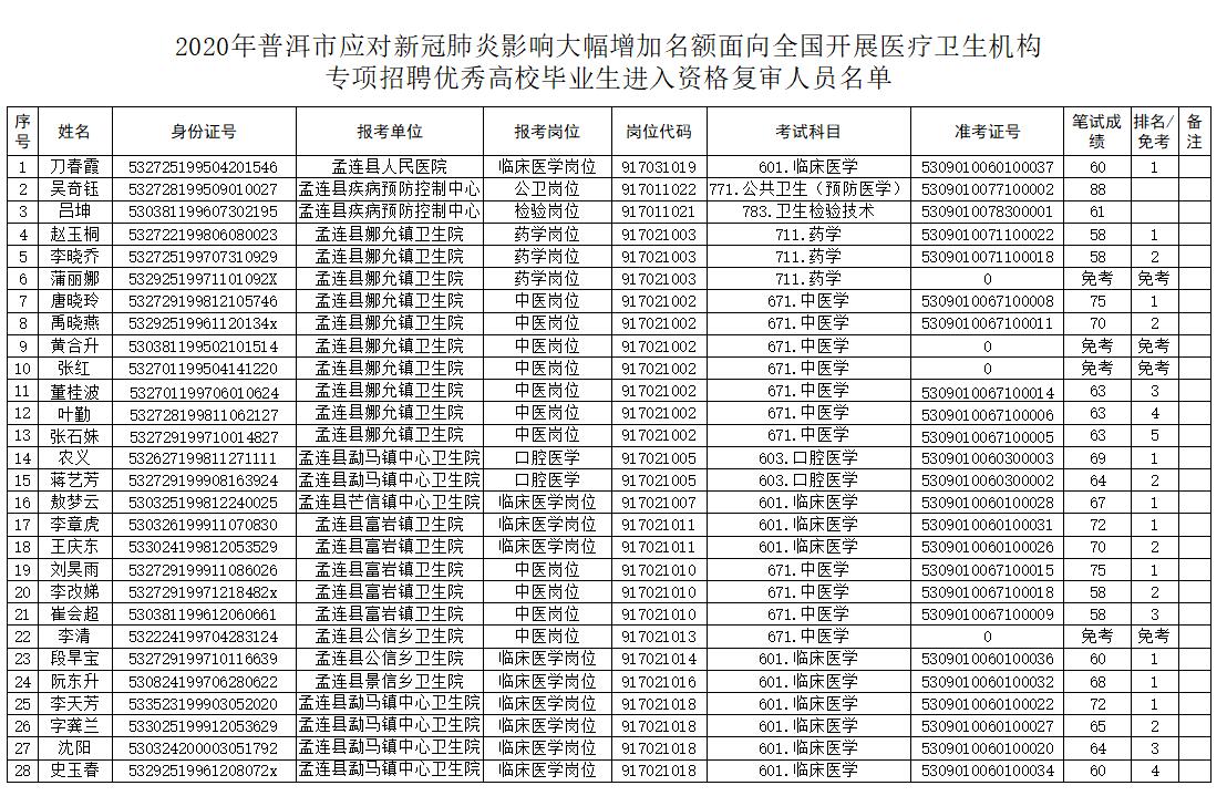 附件:2020年普洱市應(yīng)對新冠肺炎影響大幅增加名額面向全國開展醫(yī)療衛(wèi)生機構(gòu)專項招聘優(yōu)秀高校畢業(yè)生進入資格復(fù)審人員名單