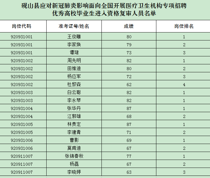 附件:硯山縣應(yīng)對新冠肺炎影響面向全國開展醫(yī)療衛(wèi)生機構(gòu)專項招聘優(yōu)秀高校畢業(yè)生進入資格復(fù)審人員名單