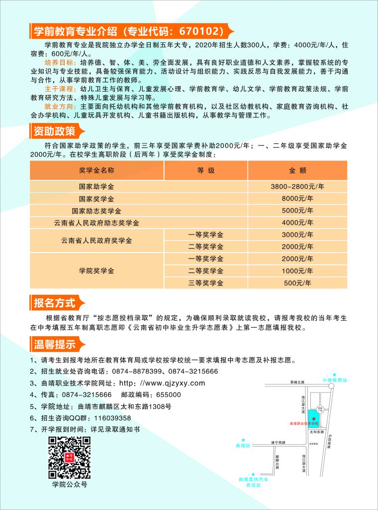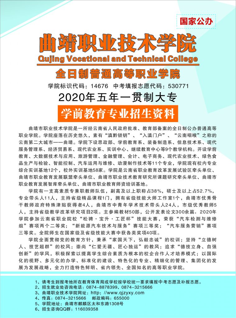 曲靖職業(yè)技術學院2020年五年一貫制大專學前教育專業(yè)招生資料 來源:http://www.qjzyxy.com/qzyxw/tzgg/1021/.html