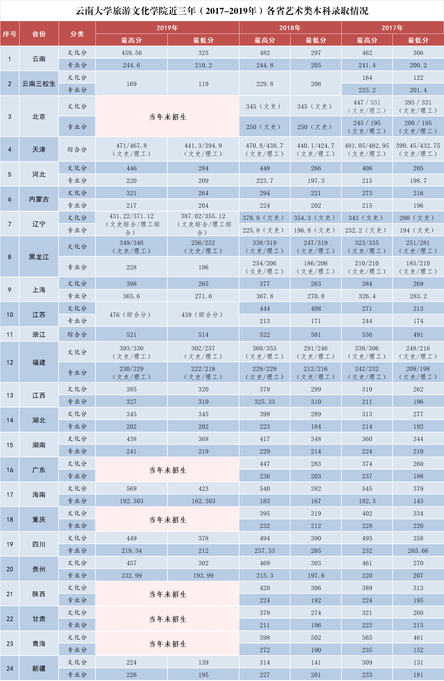 云南大學(xué)旅游文化學(xué)院2017-2019年藝術(shù)類本科各省錄取分?jǐn)?shù)情況對(duì)比