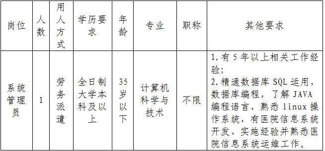 一、因單位業(yè)務發(fā)展需要,現(xiàn)面向社會公開招聘編制外系統(tǒng)管理員(勞務派遣方式)。