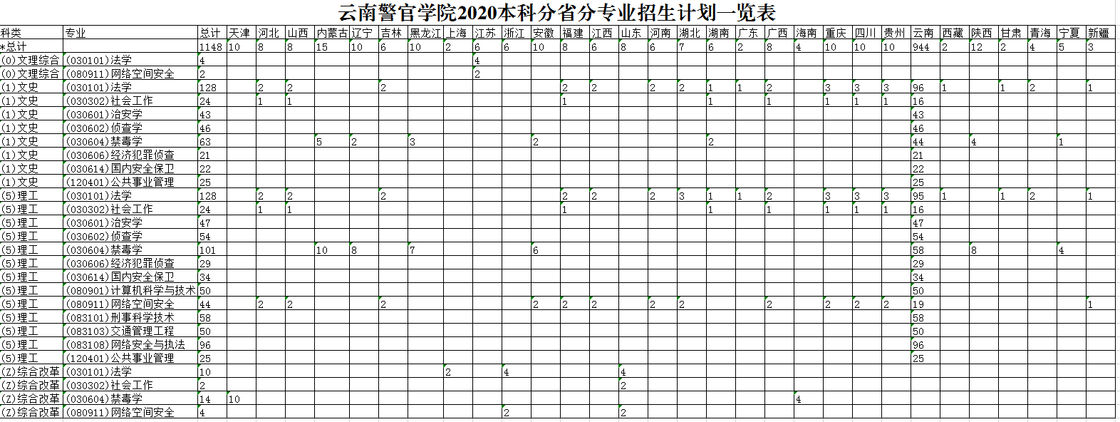 云南警官學(xué)院2020本科分省分專業(yè)招生計劃一覽表