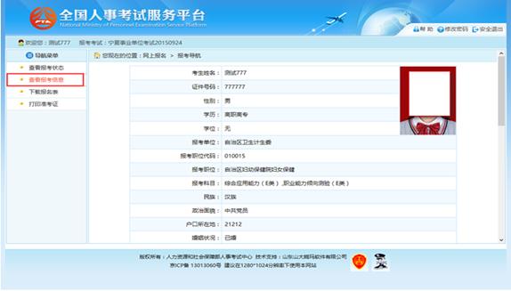 考生可以通過點擊“查看報考信息”按鈕,查看考生填寫的報考信息,如下圖所示: