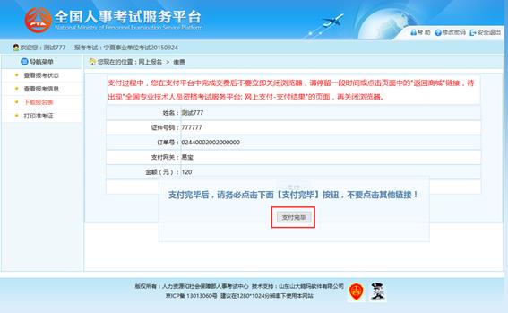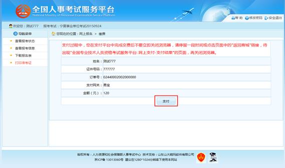 選擇完成后點擊“生成訂單”按鈕,可以生成訂單,訂單確認無誤后,點擊“支付”按鈕,成功后再點擊“支付完畢”按鈕完成網(wǎng)上支付操作,如下圖所示: