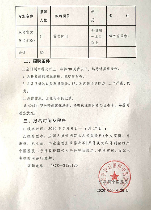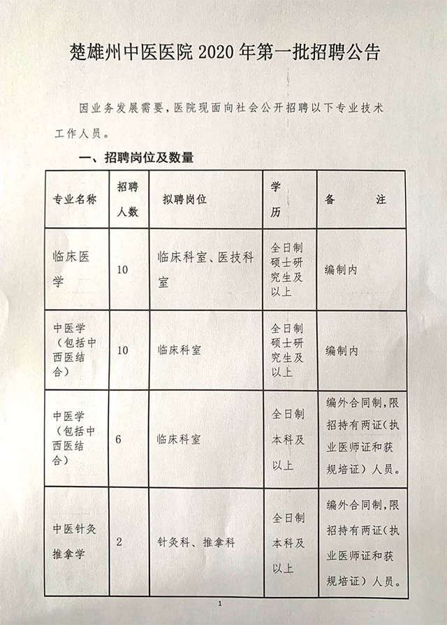 楚雄州中醫(yī)醫(yī)院2020年第一批招聘公告