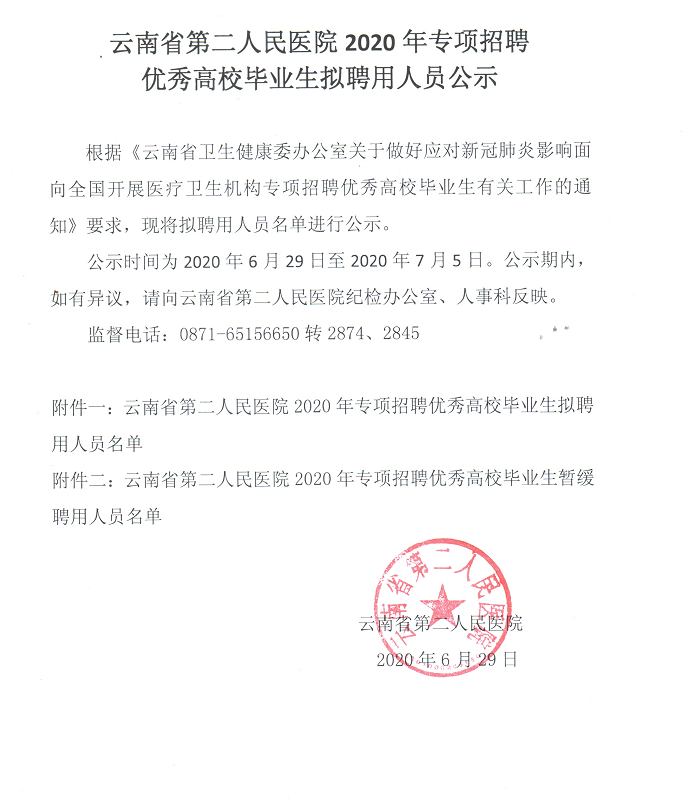 云南省第二人民醫(yī)院2020年專項(xiàng)招聘 優(yōu)秀高校畢業(yè)生擬聘用人員公示