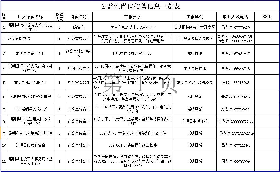 招聘具體事宜請咨詢用人單位。符合公益性崗位上崗條件的個人也可以到嵩明縣勞動就業(yè)服務(wù)局綜合科申請公益性崗位求職登記,詳詢陳老師:0871-67917444。