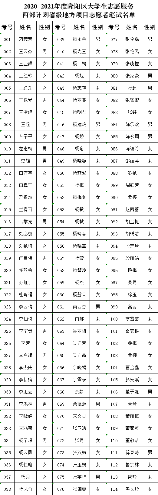 2020-2021年度隆陽區(qū)大學(xué)生志愿服務(wù)西部計劃省級地方項目志愿者筆試通知