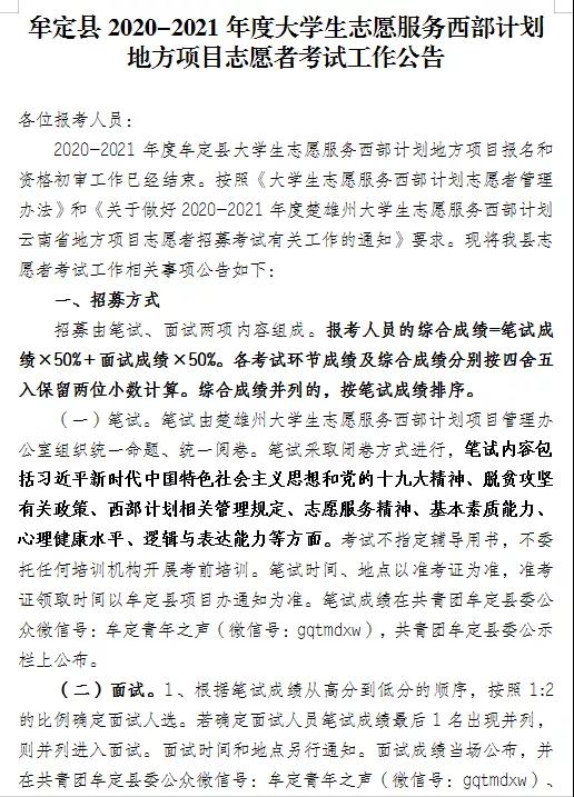 3.其他考試相關(guān)事宜詳見《牟定縣2020-2021年度大學(xué)生志愿服務(wù)西部計(jì)劃地方項(xiàng)目志愿者考試工作公告》。