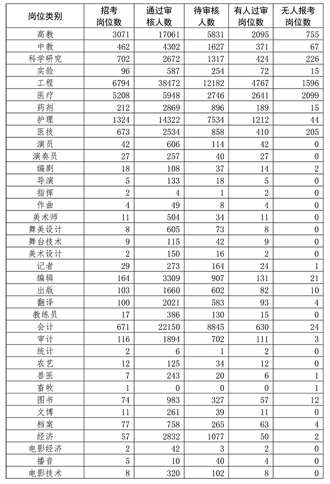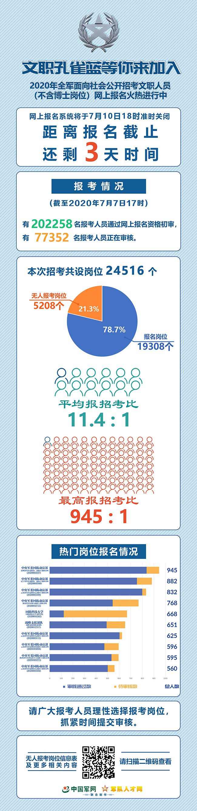 2020年全軍面向社會公開招考文職人員(不含博士崗位)網(wǎng)上報名還剩3天時間,截至2020年7月7日17時,有202258名報考人員通過網(wǎng)上報名資格初審,77352名報考人員正在審核。19308個崗位有考生報考、占78.7%,平均報招考比為11.4∶1,最高報招考比為945∶1,有5208個崗位暫時無人報考。網(wǎng)上報名系統(tǒng)將于7月10日18時準時關(guān)閉,系統(tǒng)關(guān)閉后報考人員不能進行選報崗位、修改信息和提交證明材料等操作。請廣大報考人員理性選擇報考崗位,抓緊時間提交審核。相關(guān)崗位報考情況如下:
