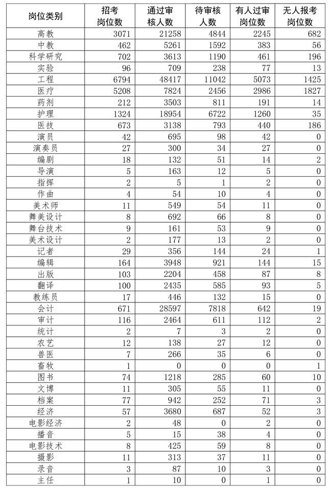 2020年全軍面向社會公開招考文職人員(不含博士崗位)網(wǎng)上報名還剩2天時間,截至2020年7月8日17時,有257045名報考人員通過網(wǎng)上報名資格初審,69453名報考人員正在審核。19934個崗位有考生報考、占81.3%,平均報招考比為13.3∶1,最高報招考比為1003∶1,有4582個崗位暫時無人報考。網(wǎng)上報名系統(tǒng)將于7月10日18時準時關(guān)閉,系統(tǒng)關(guān)閉后報考人員不能進行選報崗位、修改信息和提交證明材料等操作。請廣大報考人員理性選擇報考崗位,抓緊時間提交審核。相關(guān)崗位報考情況如下: