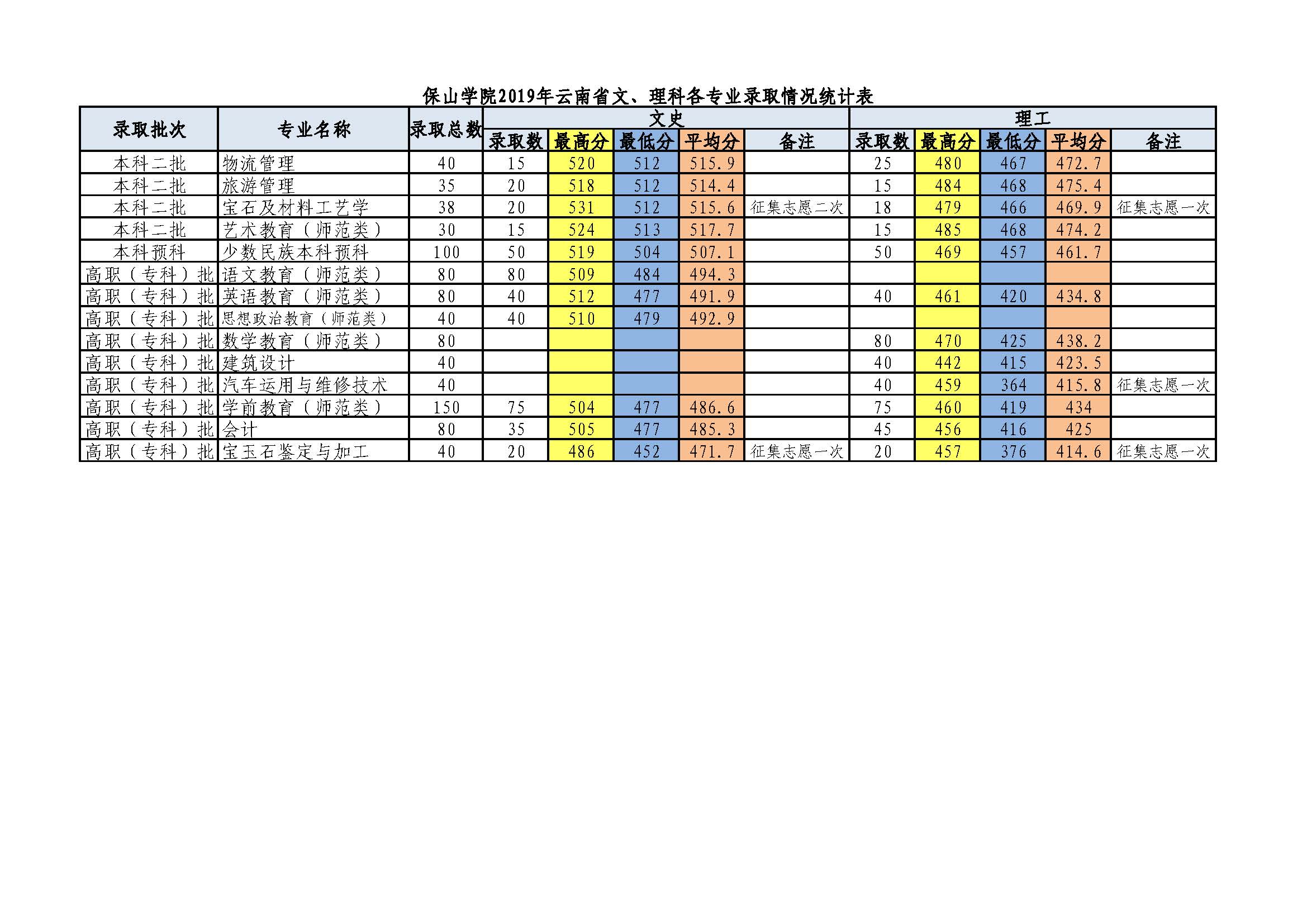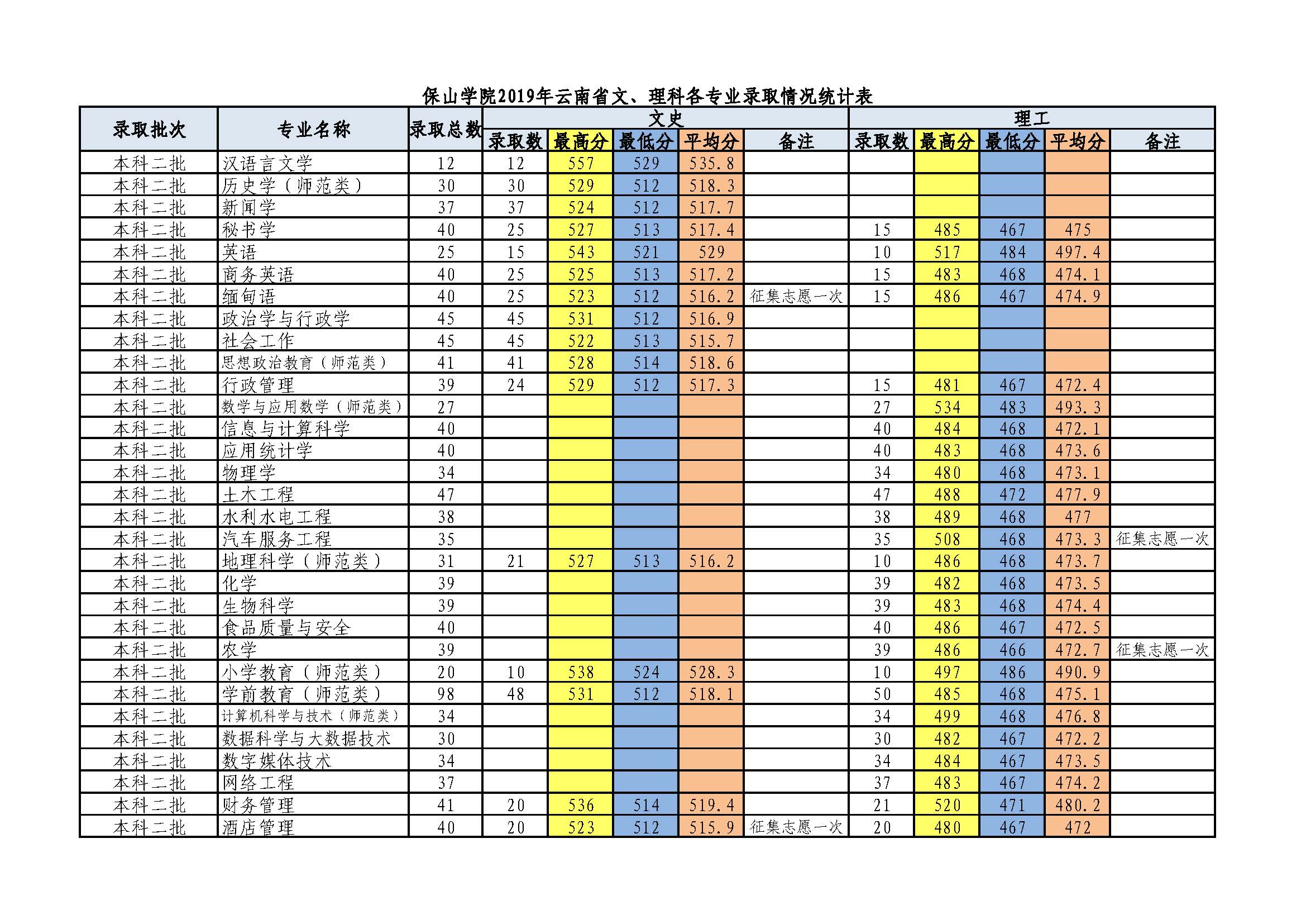 保山學(xué)院2019年云南省文、理科各專業(yè)錄取情況統(tǒng)計(jì)表
