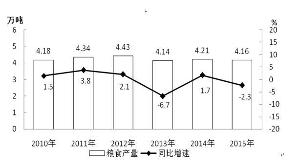例題:某市2015年全年糧食總產(chǎn)量4.16萬噸,同比下降2.3%;甘蔗產(chǎn)量0.57萬噸,下降23.6%;油料產(chǎn)量0.12萬噸,增長32.4%;蔬菜產(chǎn)量15.79萬噸,下降3.4%;水果產(chǎn)量7.84萬噸,增長7.4%。