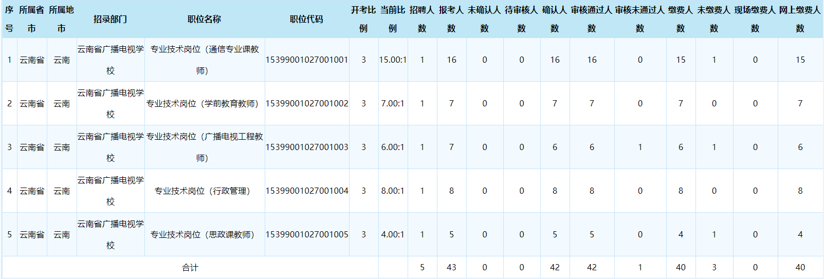 云南省廣播電視學校2020年招聘報名數據(截止7月4日18:00)